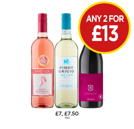 Barefoot White Zinfandel, Caparelli Pinot Grigio, McGuigan Shiraz - Any 2 for £13 at Budgens