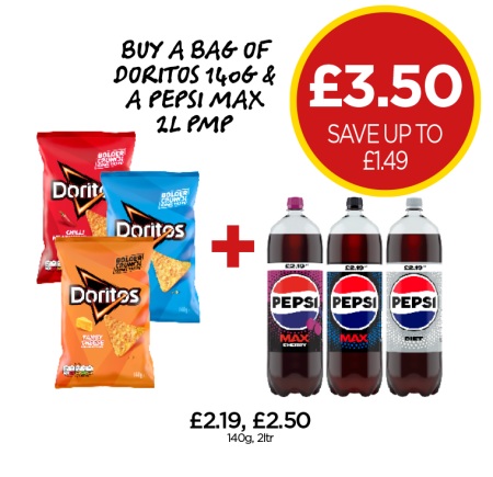 Doritos Chilli Heatwave, Cool Original, Cheese, Pepsi Diet, Max, Cherry - Now Only Buy A Bag of Doritos & A Pepsi Max for £3.50 at Budgens