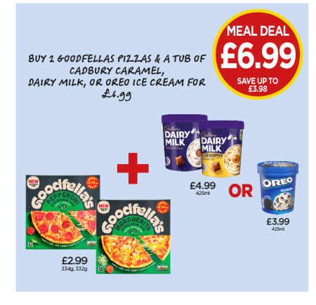 Goodfella's Pizza Pepperoni, Margherita, Cadbury Ice Cream Dairy Milk, Caramel, Oreo - Buy 2 Goodfellas Pizzas & A Tub of Cadbury Caramel, Dairy Milk Or Oreo for £6.99 at Budgens