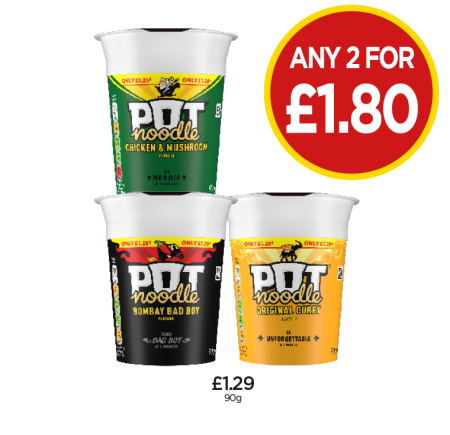 Pot Noodle Chicken & Mushrooms, Bombay Bad Boy, Original Curry - Any 2 for £1.80 at Budgens