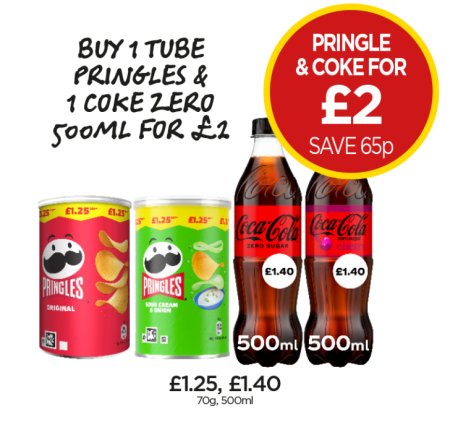 Pringles Salted, Sour Cream, Coke Zero, Cherry - Buy 1 Pringles & Coke Zero for £2 at Budgens