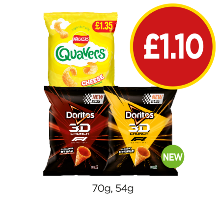 Quavers, Doritos 3D Crunch Sizzling Steak, Nacho Cheese - Now Only £1.10 at Budgens