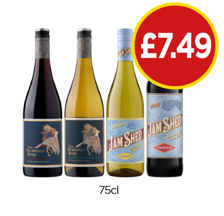 The Secretary Bird Merlot, Sauvignon Blanc, Jam Shed Chardonnay, Tempranillo - Now Only £7.49 at Budgens